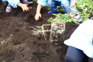 年少組と年中組が近隣の畑にジャガイモ掘りに行きました。